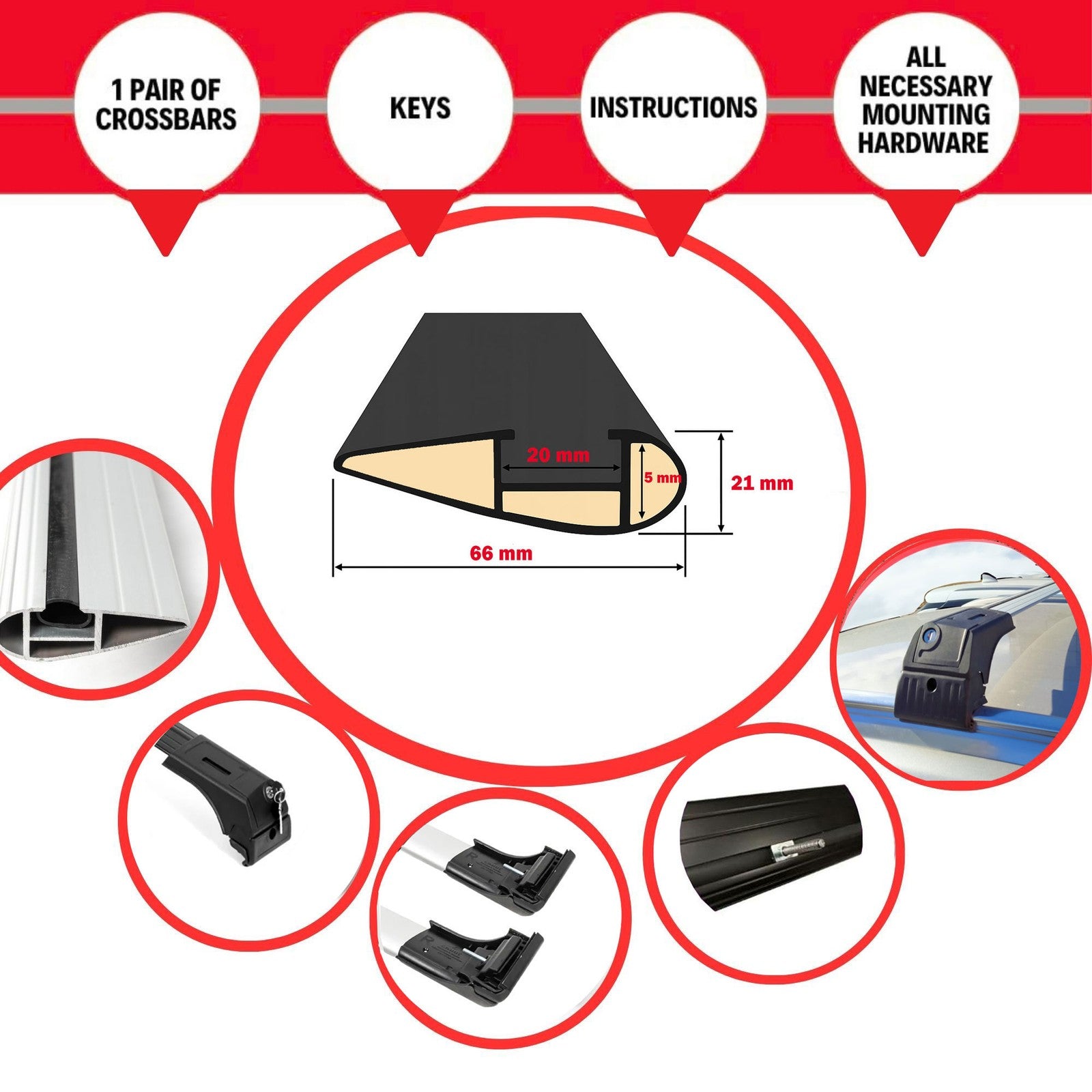 Package Includes: 2 bars, 4 mounting feet, locking keys, and an Allen key.