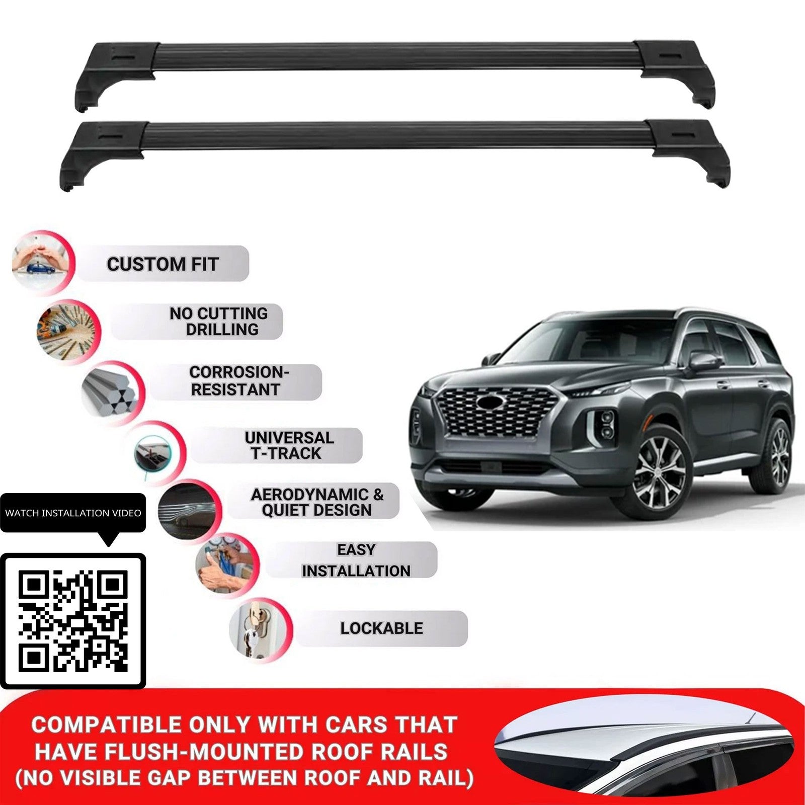 Aluminum Roof Bars for Cars with Flush-Mounted Roof Rails, Compatible with Hyundai Palisade Suv 2018-2019-2020-2021-2022-2023-2024