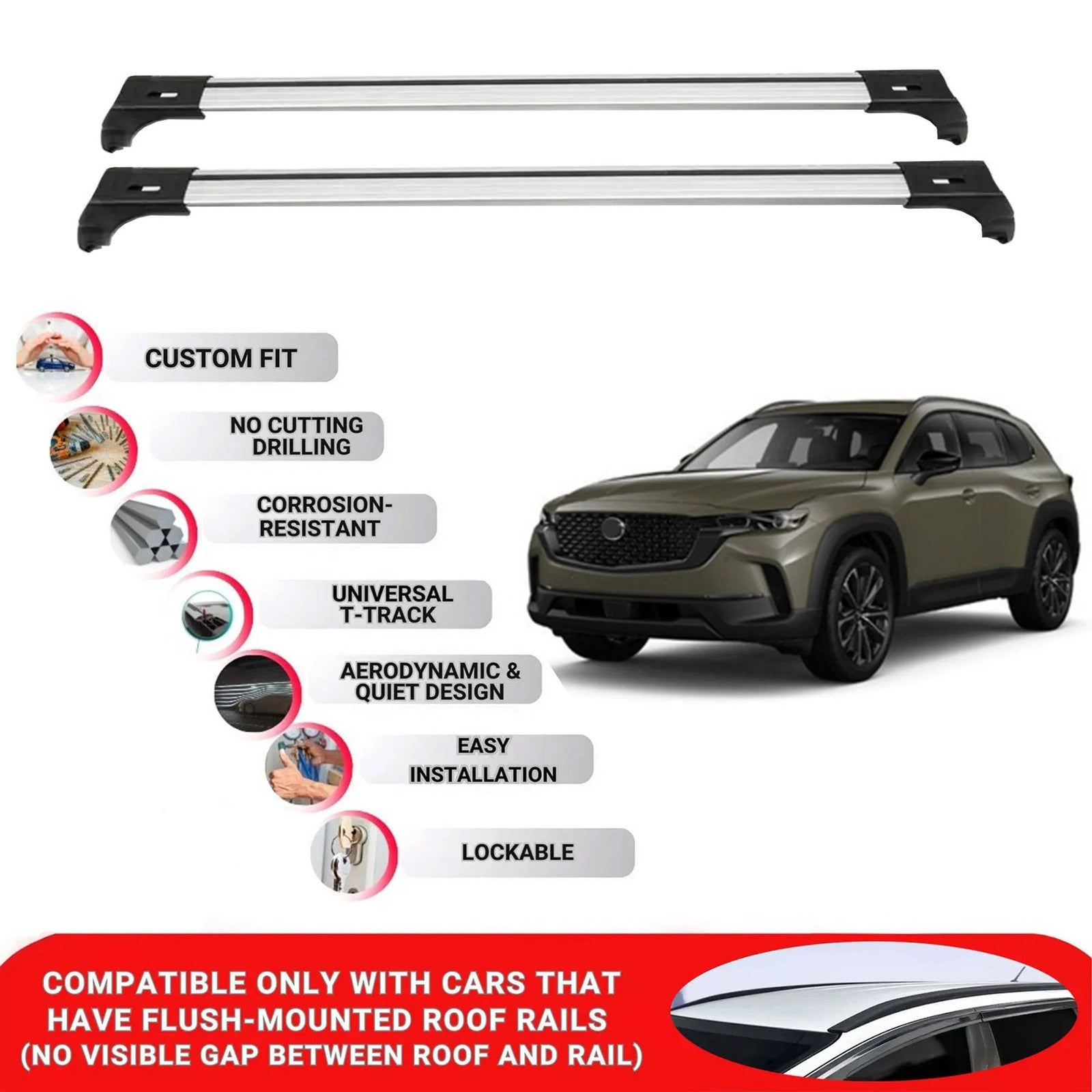 Aluminum roof bars for cars with roof rails, compatible with Flush-Mounted Roof Rails for Mazda Cx-502023|2024|2025|2026. Made from rust-resistant aluminum for long-lasting durability. Ideal for carrying luggage, bicycles, camping gear, and other cargo. Easy to install and remove, making them perfect for travel and storage needs.