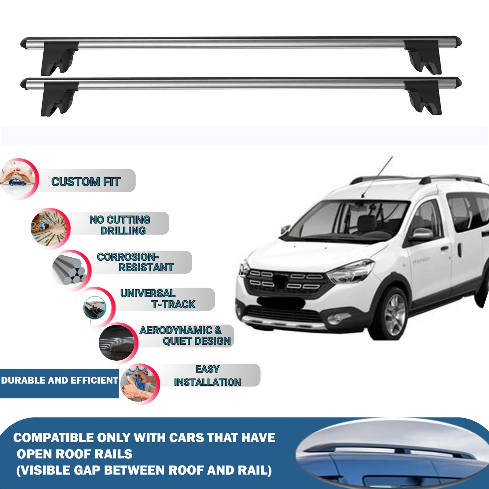 Aluminum Roof Bars for Cars with Raised Roof Rails, Compatible with Dacia Dokker 2012-2013-2014-2015-2016-2017-2018-2019-2020-2021-2022-2023