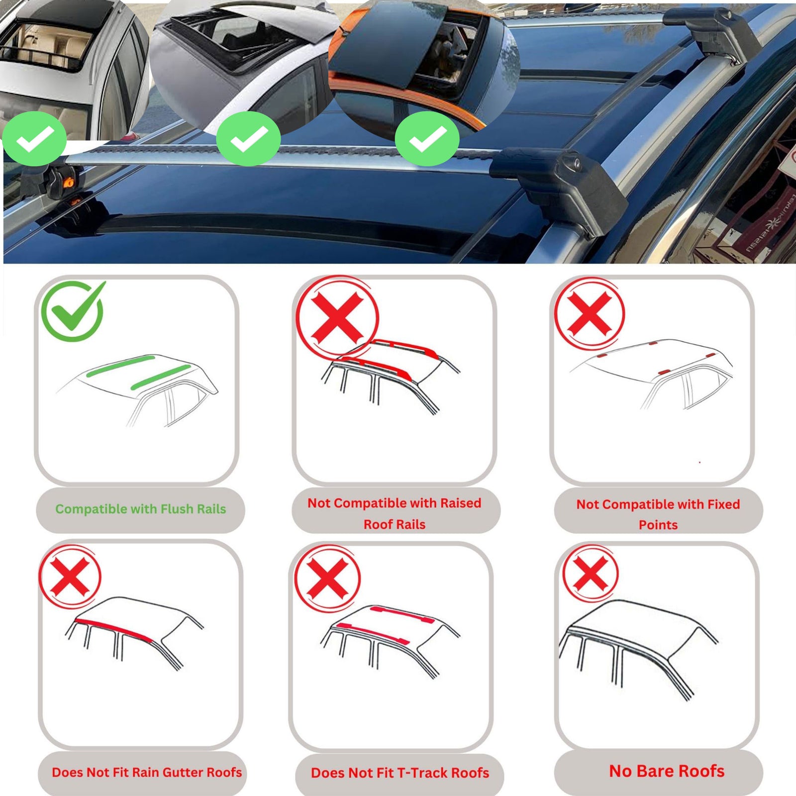 These cross bars are not compatible with raised or integrated roof rails, which are mounted higher or closer to the roof. Please ensure your vehicle has flush-mounted roof rails before purchasing.