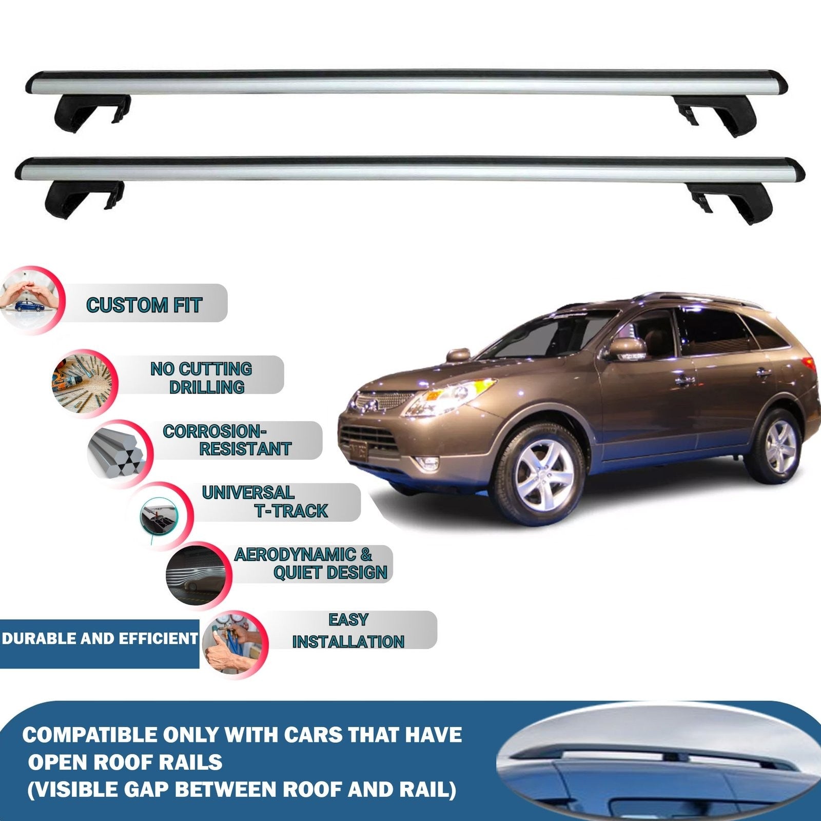 Suitable for vehicles with a gap between the roof and roof rails, not suitable for integrated-flush roof rails.
