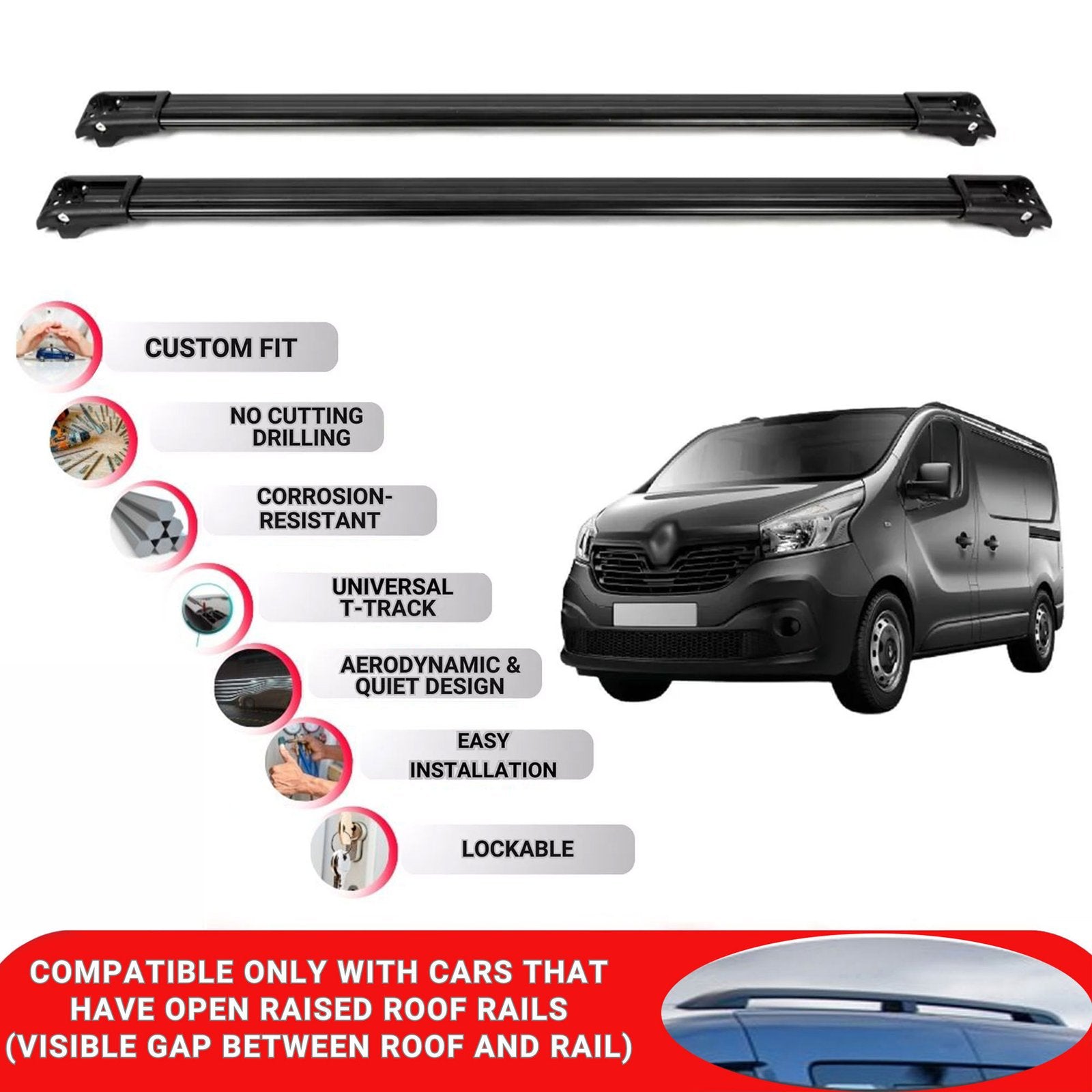 This product is designed for vehicles with raised roof rails only. It is not compatible with flush-mounted or integrated roof rails. Please ensure your vehicle has raised roof rails before purchasing.