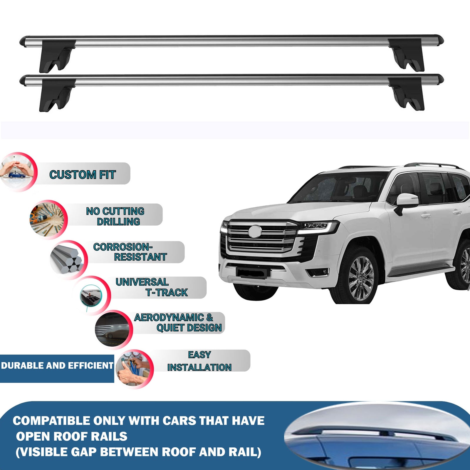 Please ensure your vehicle has raised roof rails with a gap between the roof and the rails before purchasing.