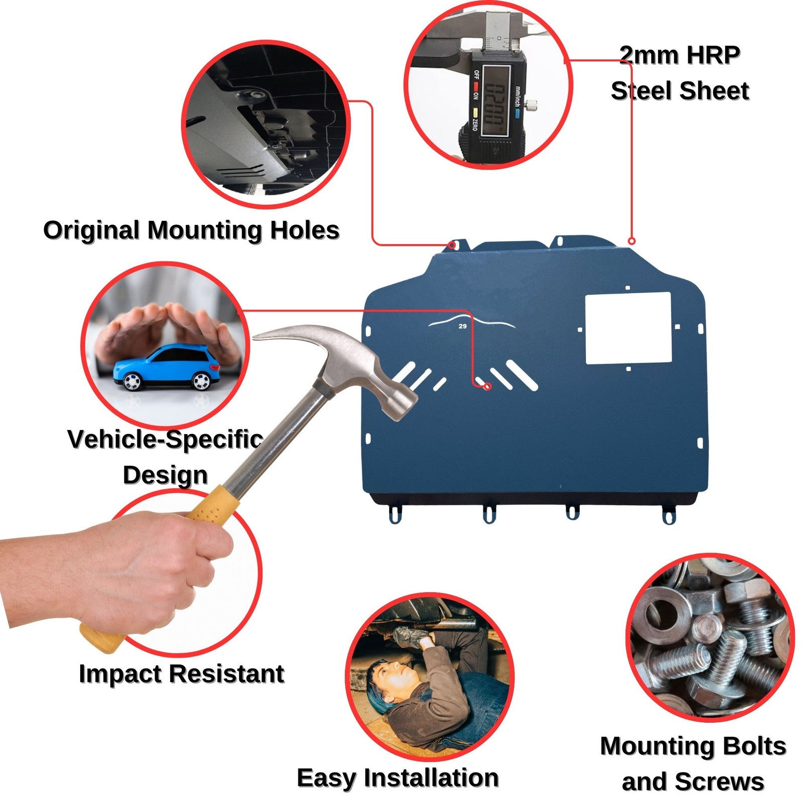 This **Under Engine Cover** effectively protects your engine, oil pan, and chassis from road debris, water damage, mud, and stone impact for extended vehicle longevity. Ideal as a **Front Skid Plate** and **Rust Shield** for long-lasting protection. Built with **Premium Steel Material**, it is highly **Rust-Resistant**.